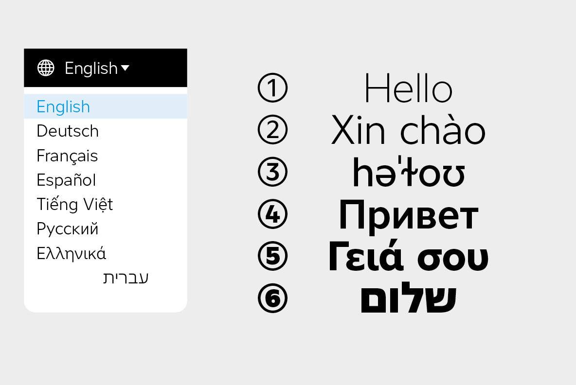 Containing more than 2,000 characters, Atwic Pro supports four writing systems: Latin, Cyrillic, Greek, and Hebrew. It also covers Vietnamese, Pan-African Latin, the International Phonetic Alphabet (IPA), Bulgarian Cyrillic, polytonic Greek, national currency and cryptocurrency symbols, and pictograms (icons). Its extensive character set makes Atwic Pro a powerful communication tool and instrumental in global brand and campaign communications. Multilingual ingredient labels. Multilingual websites, apps, and conferences.
